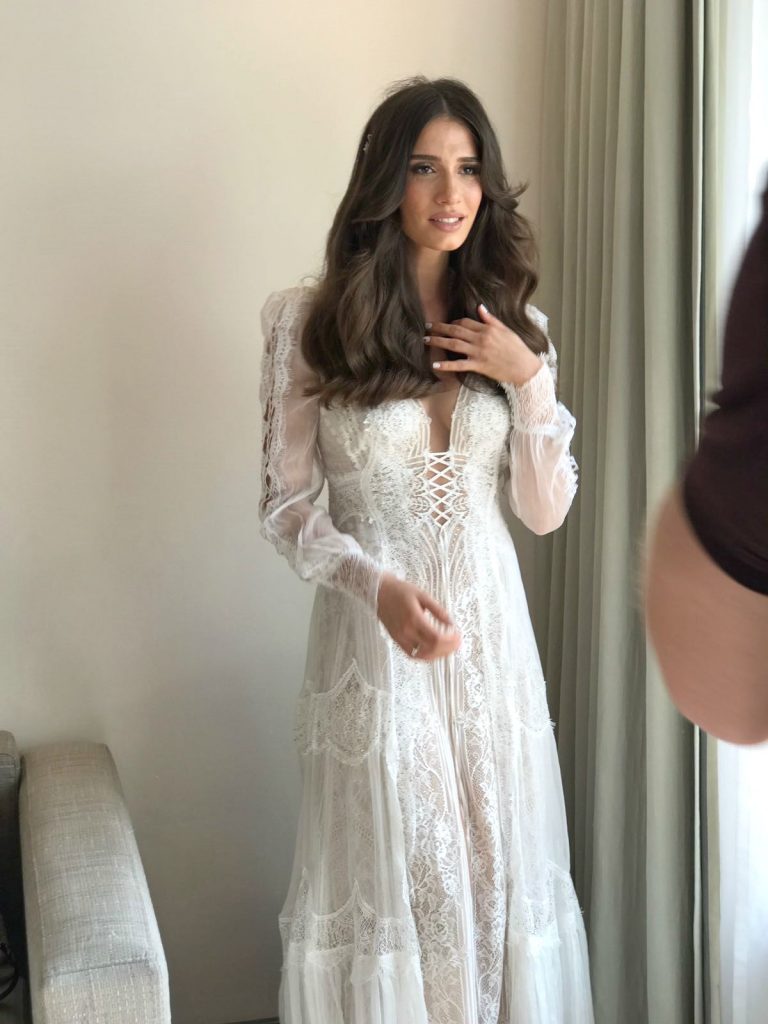 אנחנו התאהבנו בסגנון המרחף של שמלת הכלה של אמסלם, שהעניקה מסגרת אלגנטית לאאוטפיט הכולל של אמסלם.