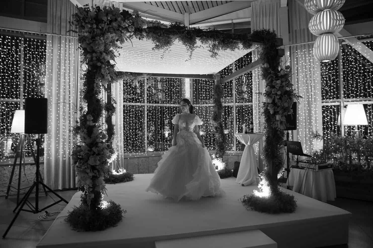 "השמלה השנייה, לריקודים, היא שמלה בסגנון בוהו שיק עם טוויסט של גלאמור. היא עוצבה בהשראת שרשרת זכוכיות סברובסקי בעבודת יד שעיצבנו עבור עדן.