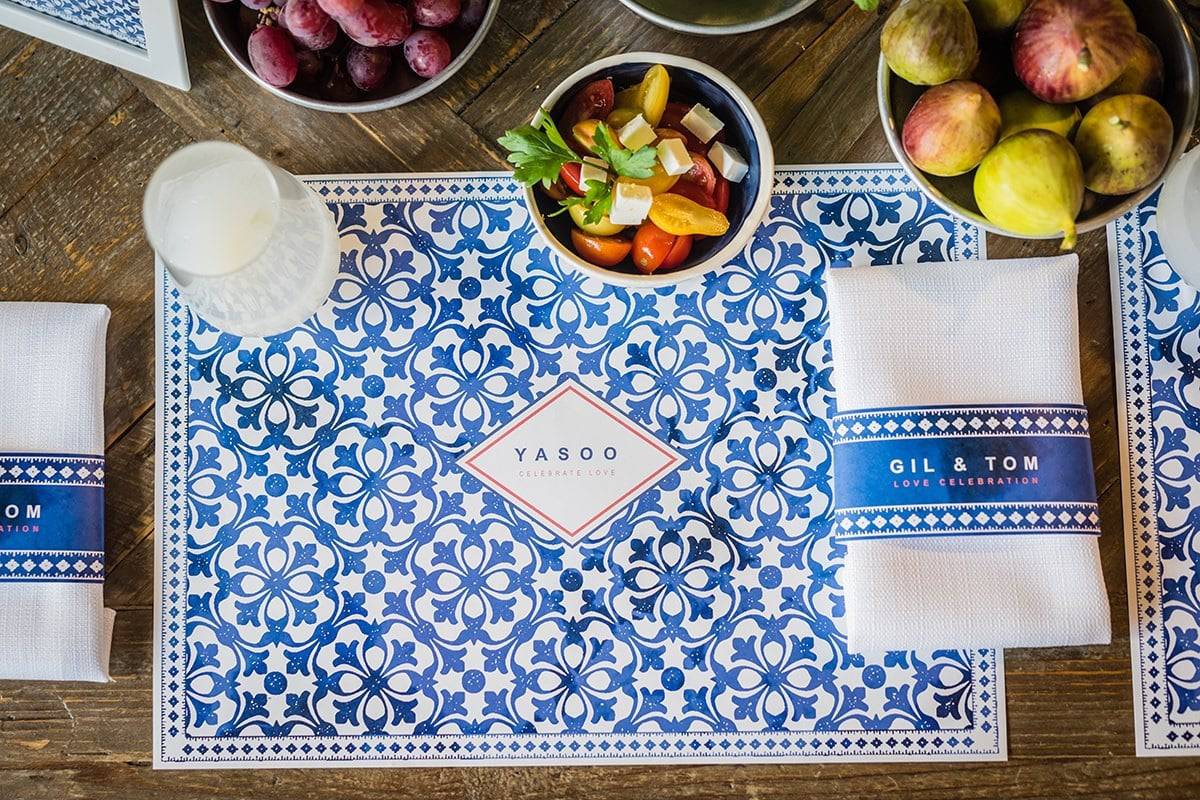 במקרה הזה, הסגנון היווני בא לידי ביטוי בעיצוב החתונה בהדפס דמוי מרצפות הקרמיקה בצבעי כחול-לבן עם טאץ' עדין של צבע אדום.