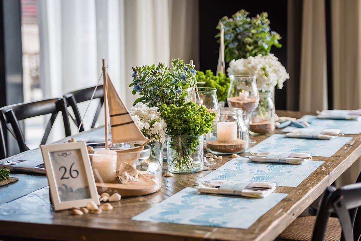 כדי לחבר בין העיצוב הגרפי לעיצוב האירוע, בחרו גם ליצור מספר מרכזי שולחן המתאימים למוטיב הימי, כמו כלי זכוכית שקופים מלאי חול וצדפים או סירות מפרש דקורטיביות.
