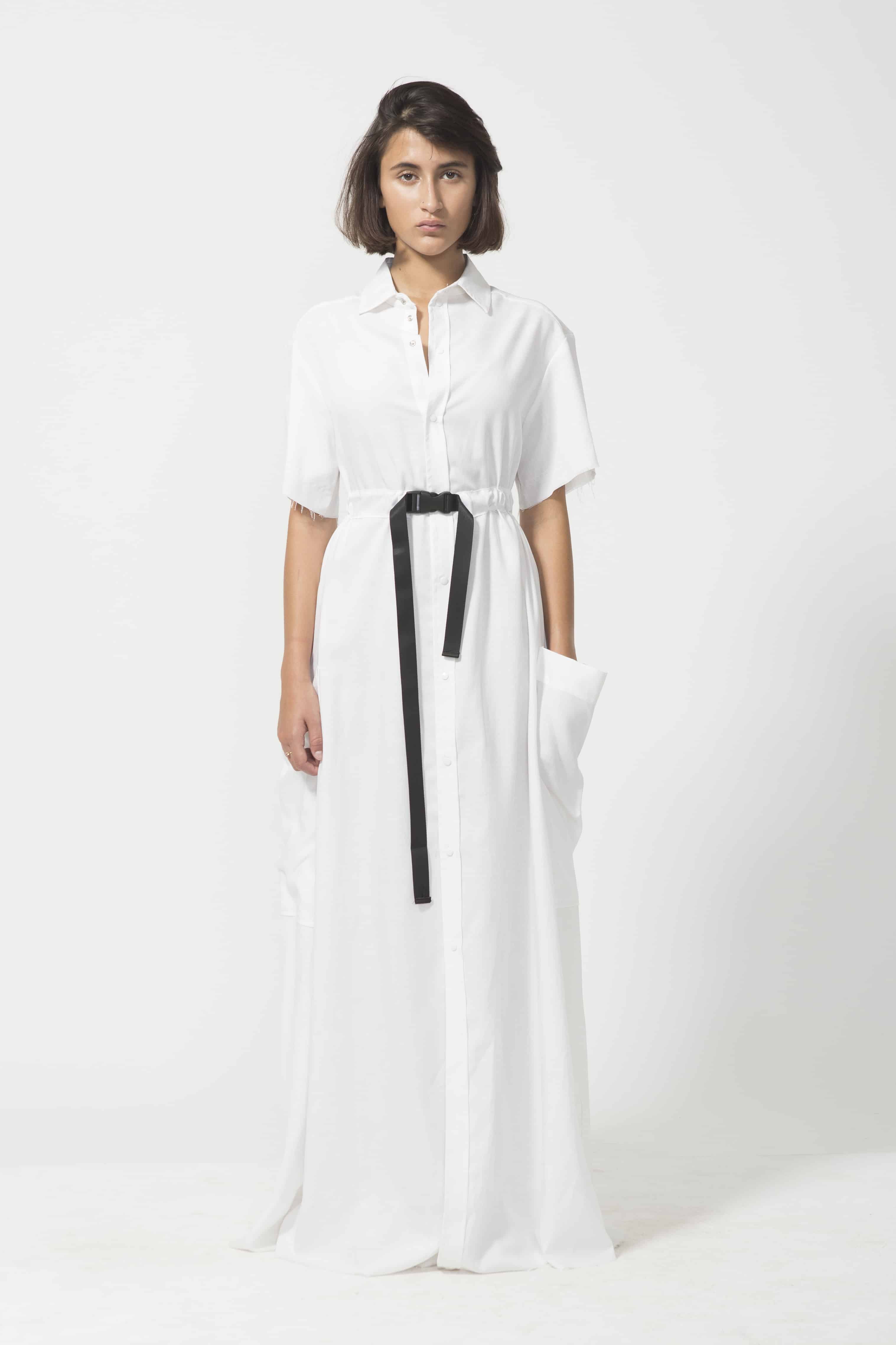שמלת מקסי מכופתרת עם חגורה שחורה להתאמת המותניים. להשיג בHolyland Civilians.
