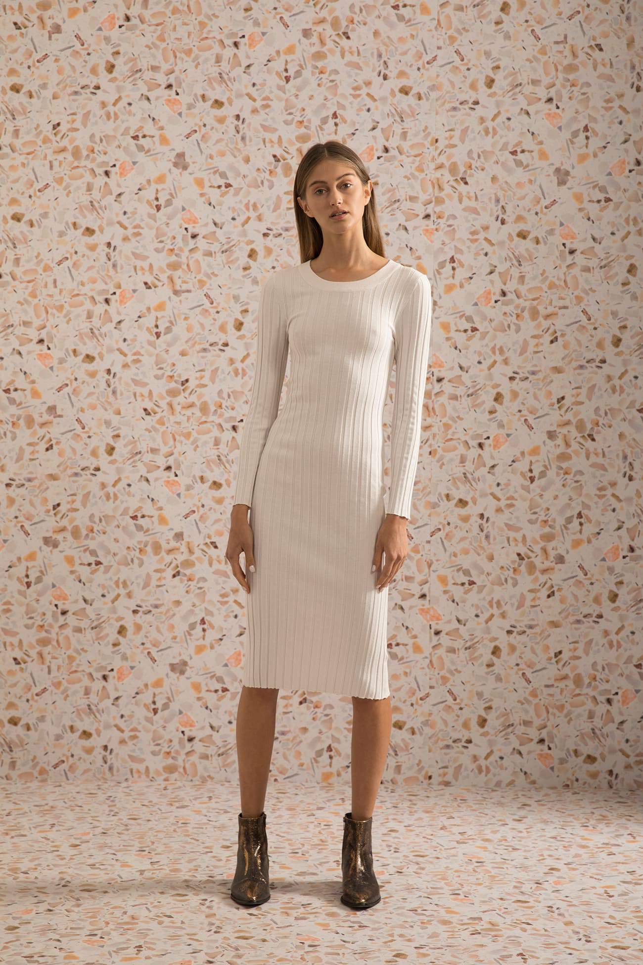 שמלת סריג לבנה עם שרוולים ארוכים. להשיג ברשת Sack's.