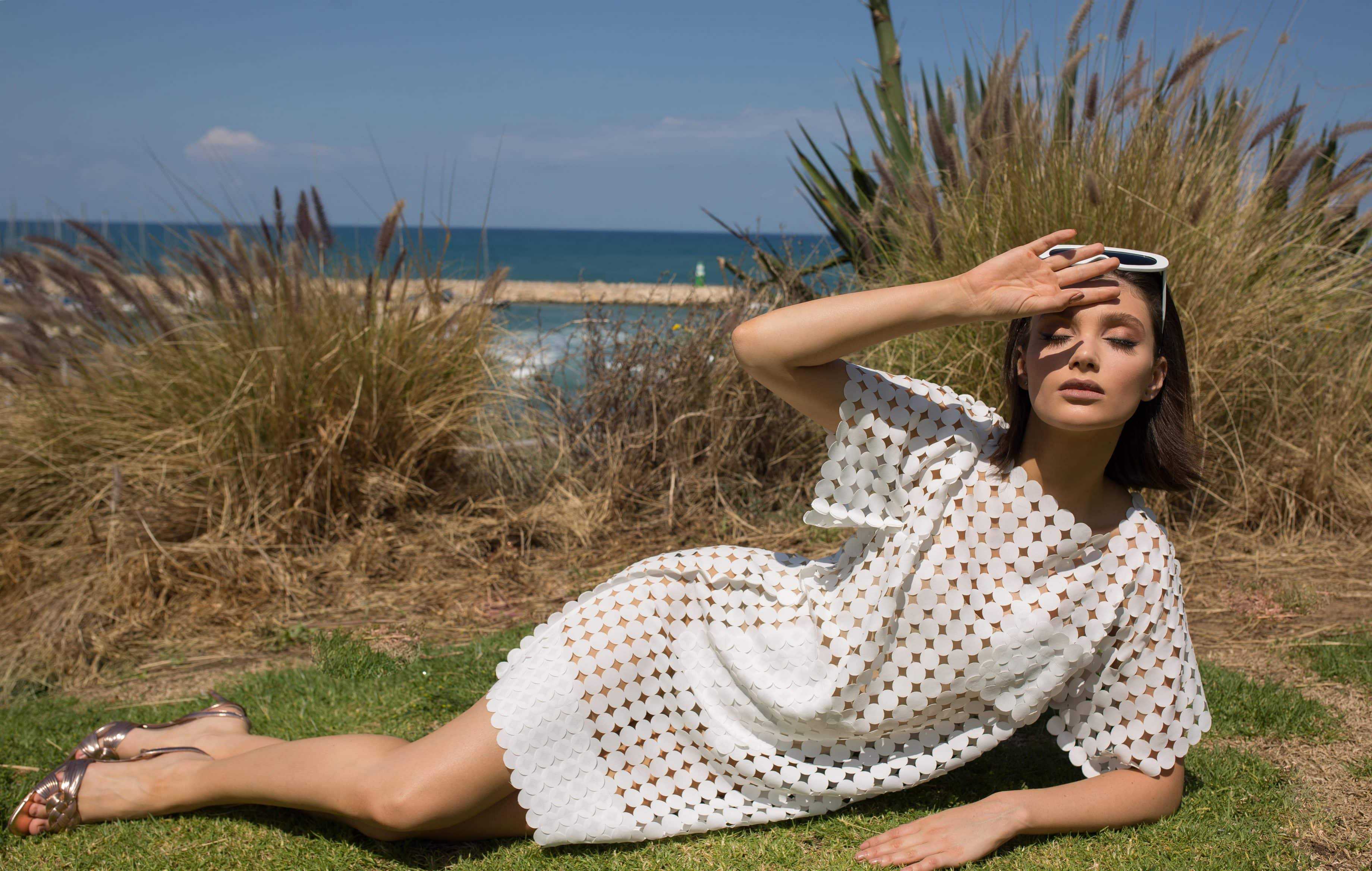 שמלת מיני לבנה בחיתוך לייזר גיאומטרי. להשיג בסטודיו אליאן סטולרו.