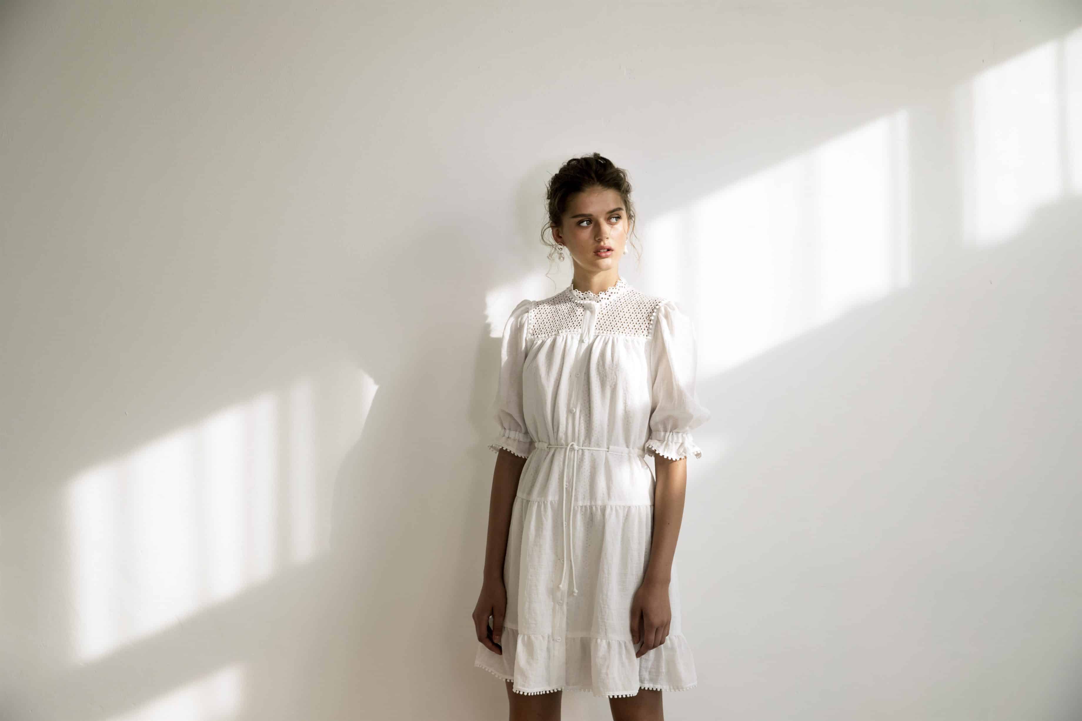 שמלת מיני לבנה עם שרוולים תפוחים. להשיג בסטודיו סבינה מוסייב.